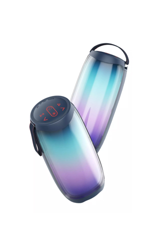 مكبر صوت متنقل لاسلكي من شركة ويو , بنظام تغيير الألوان بإضاءة مميزة ,بسعة بطارية 3000 ملي امبير ومنفذ تايب سي للشحن ومنفذ يو اس بي ومنفذ لبطاقة التخزين ,مقاومة, للماء , بمدى اتصال يصل الى 10 متر كما تحتوي على راديو